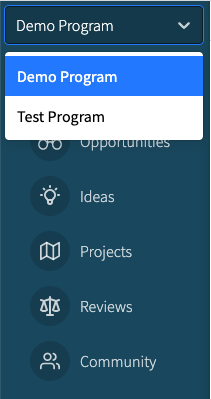 You may access each innovation program you have been permissioned to access using the Program Selector drop-down list that appears at the top of the LaunchPath navigation bar.