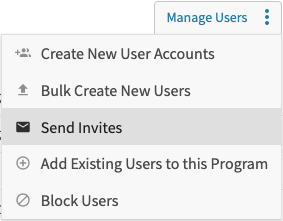 Hover over the Manage Users button and select "Send Invites." (NOTE: This option will only be available if there are user accounts in the program that have a status of "New." )