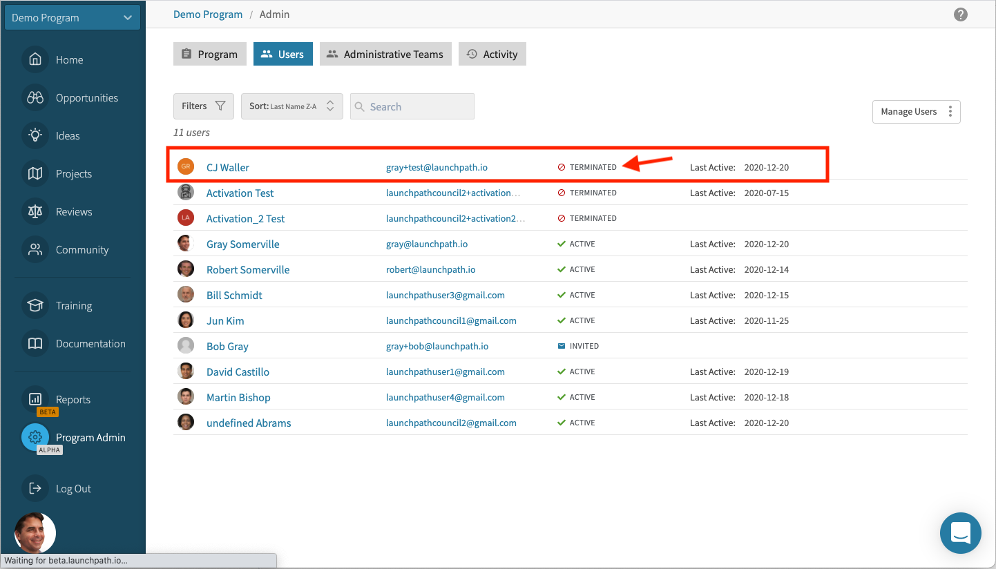 - Removing user access to your account such that the user(s) in question are blocked from accessing any of your LaunchPath programs.