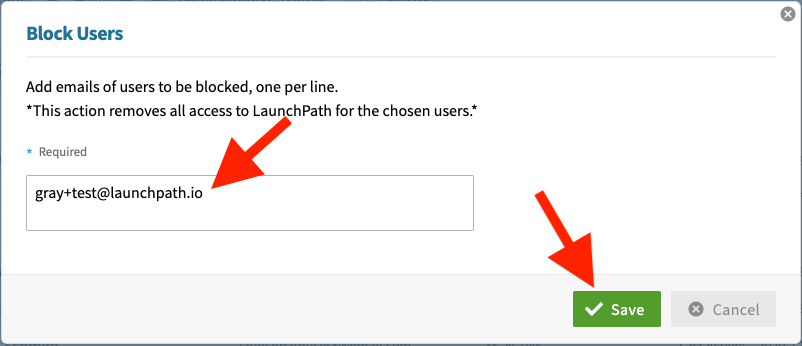 Enter the email address(es) of the user(s) to be blocked, and select the Save button.