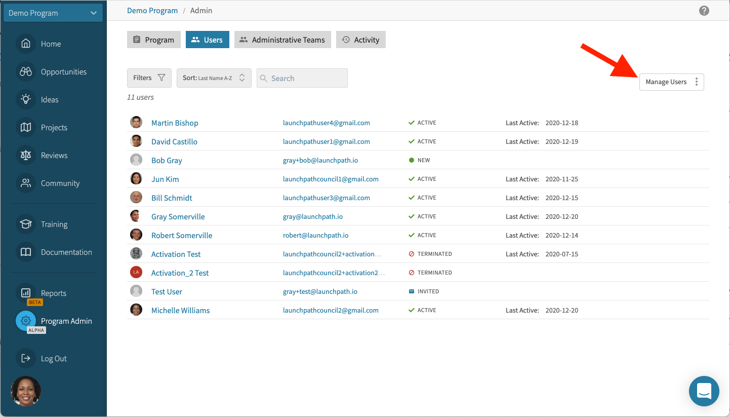 Go to Program Settings > Users, where you will see a screen that looks like this, with a button on the right labeled, "Manage Users."