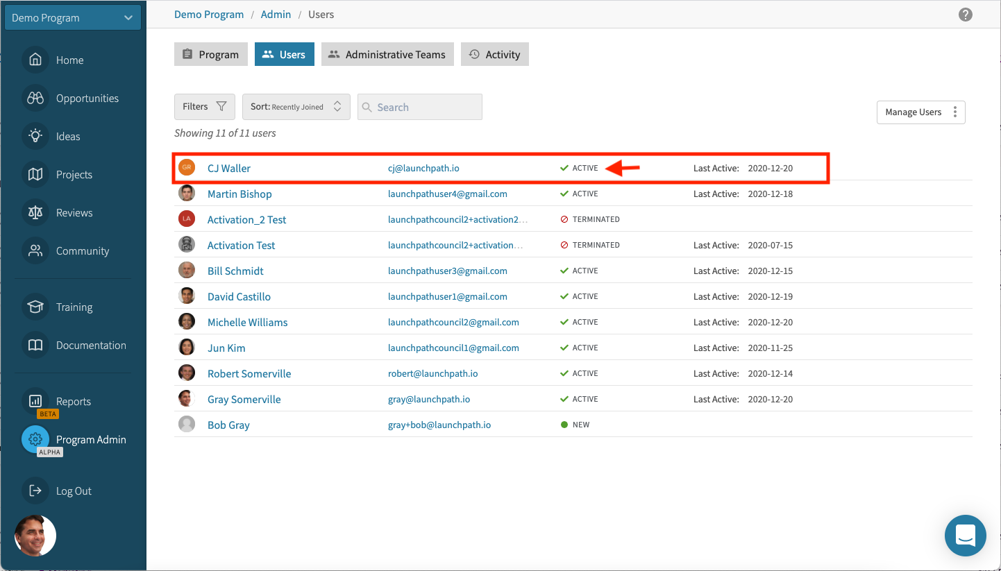 The user(s) will now appear as "active" within the program, which means that when they log into LaunchPath, they will be able to navigate to the program in question using the Program Selector drop-down list located at the top of the navigation menu.